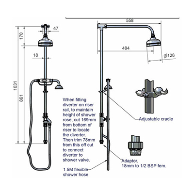 The Exposed Thermostatic Shower Set from Silverdales Classic range includes a shower valve, overhead shower arm, riser rail, shower rose and diverter. Cheerful and sparkling in a smart chrome finish, it will kick-start your day with a flourish. Crafted from high-grade brass, it is also optionally available in other eye-catching finishes. Additionally, it ensures your safety with an automatic shut down in case of water supply failure.