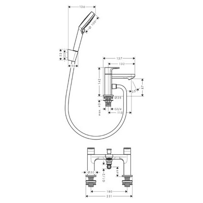 Rebris S 2-hole rim mounted bath mixer with diverter valve and Vernis Blend hand shower Vario Matt B The design is timeless and can blend in harmoniously anywhere in the bathroom where water is enjoyed. Rebris bathroom taps are reliable and high quality. So you will get a lot of joy out of the produc