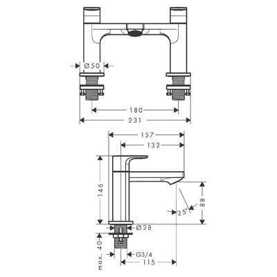 Rebris E 2-hole rim mounted bath mixer with diverter valve and Vernis Blend hand shower Vario Matt B The design is timeless and can blend in harmoniously anywhere in the bathroom where water is enjoyed. Rebris bathroom taps are reliable and high quality. So you will get a lot of joy out of the produc